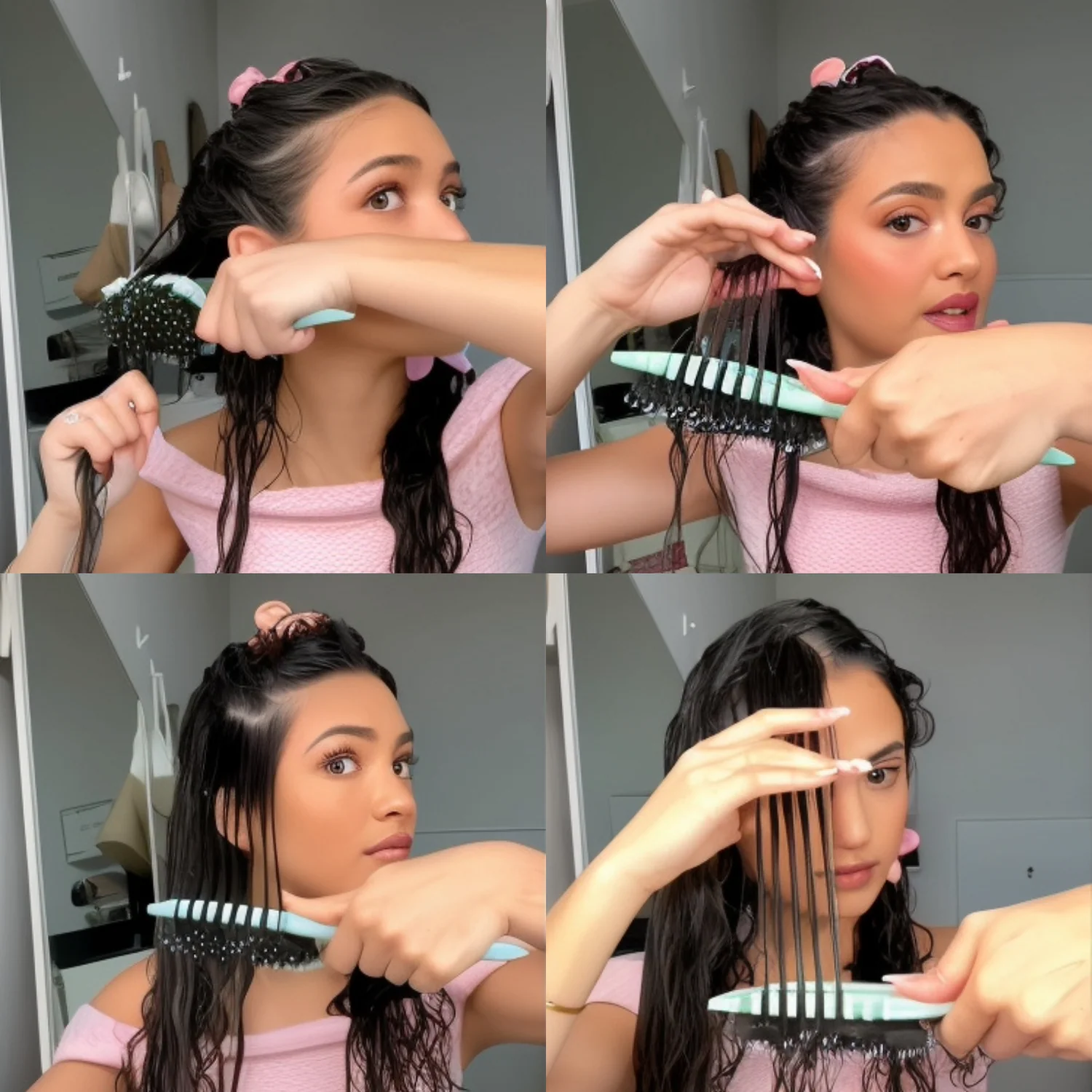 Start with damp curls and your favorite product. Brush downward slowly, and you’ll see your curls instantly pop into smooth, shiny clumps. It’s effortless—and oddly satisfying.